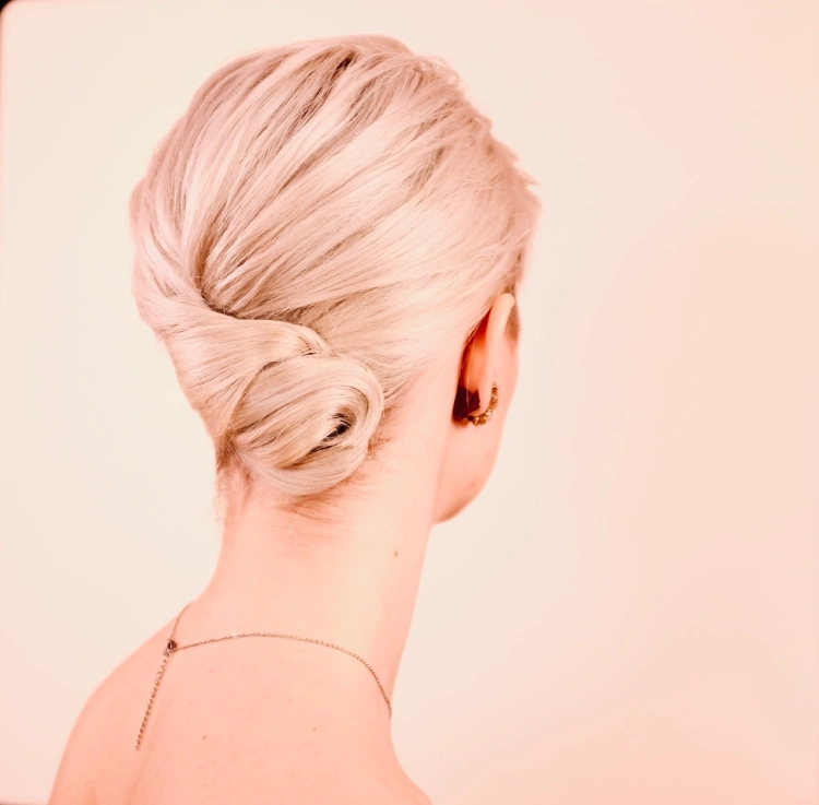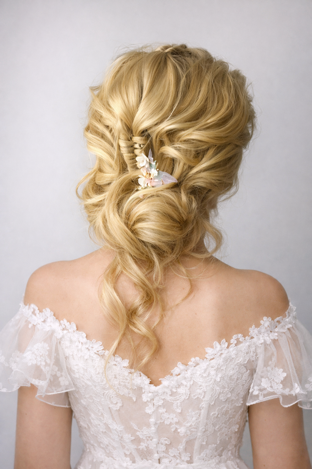 Hochzeitsfrisur, Nackenknoten mit floralen Elementen