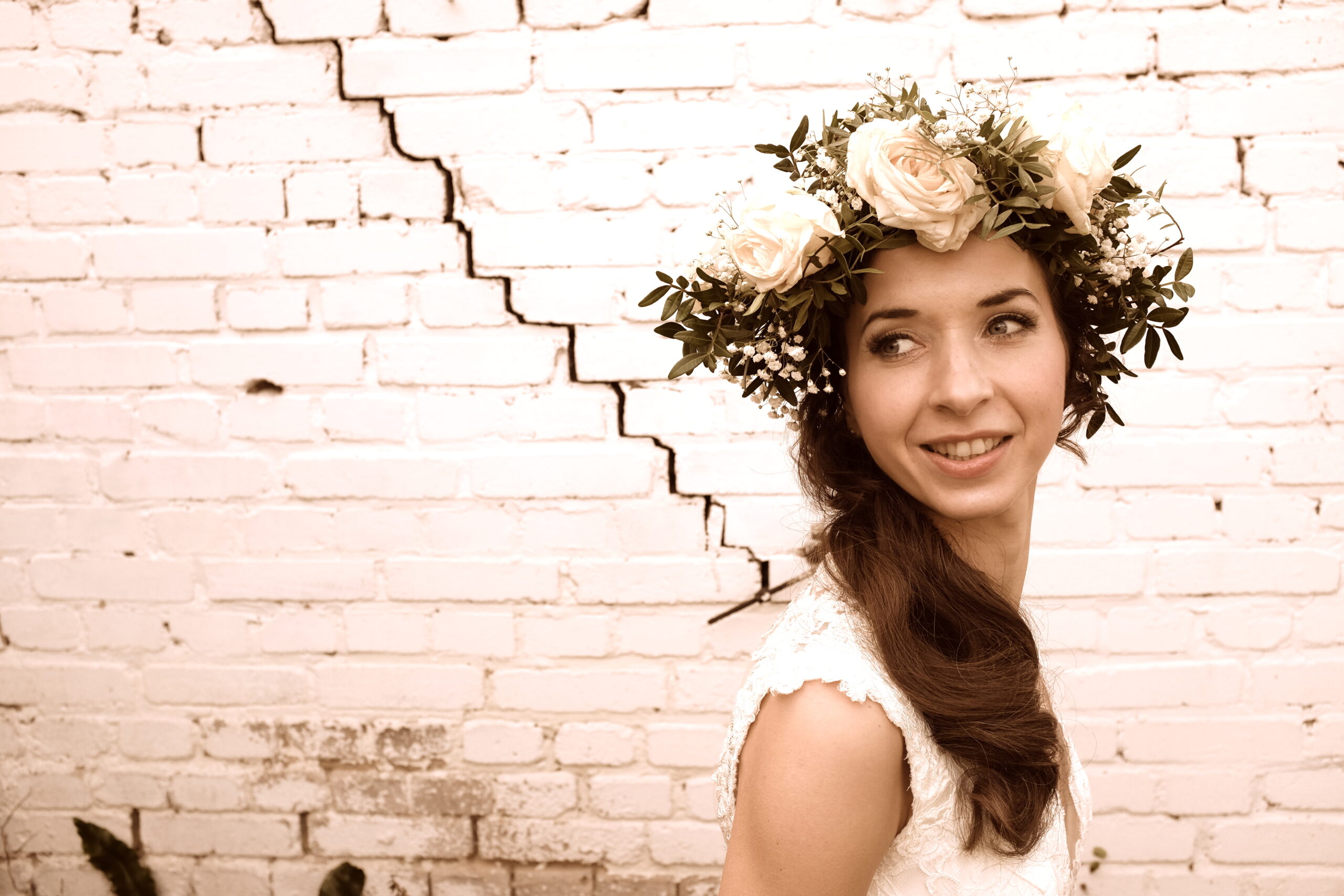 Hochzeitsfrisur mit Haarverlängerung und selbstgefertigtem Blumenkranz